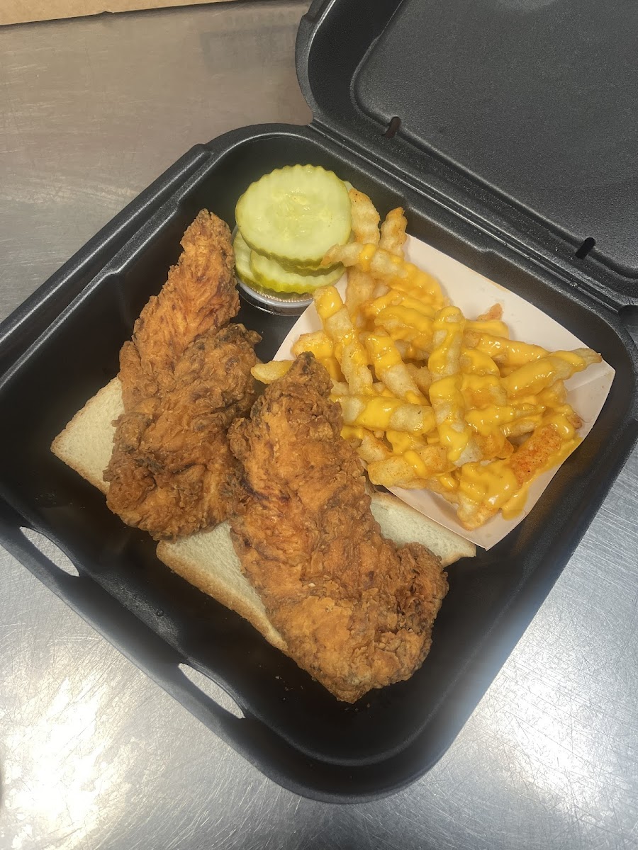 Chicken strips were fair size and chunky. Very hot and juicy. Fries were seasoned right. The bread, I wish they'd toast. Tables and restroom were clean. Lots of parking space. Medium and hot hear level just perfect.