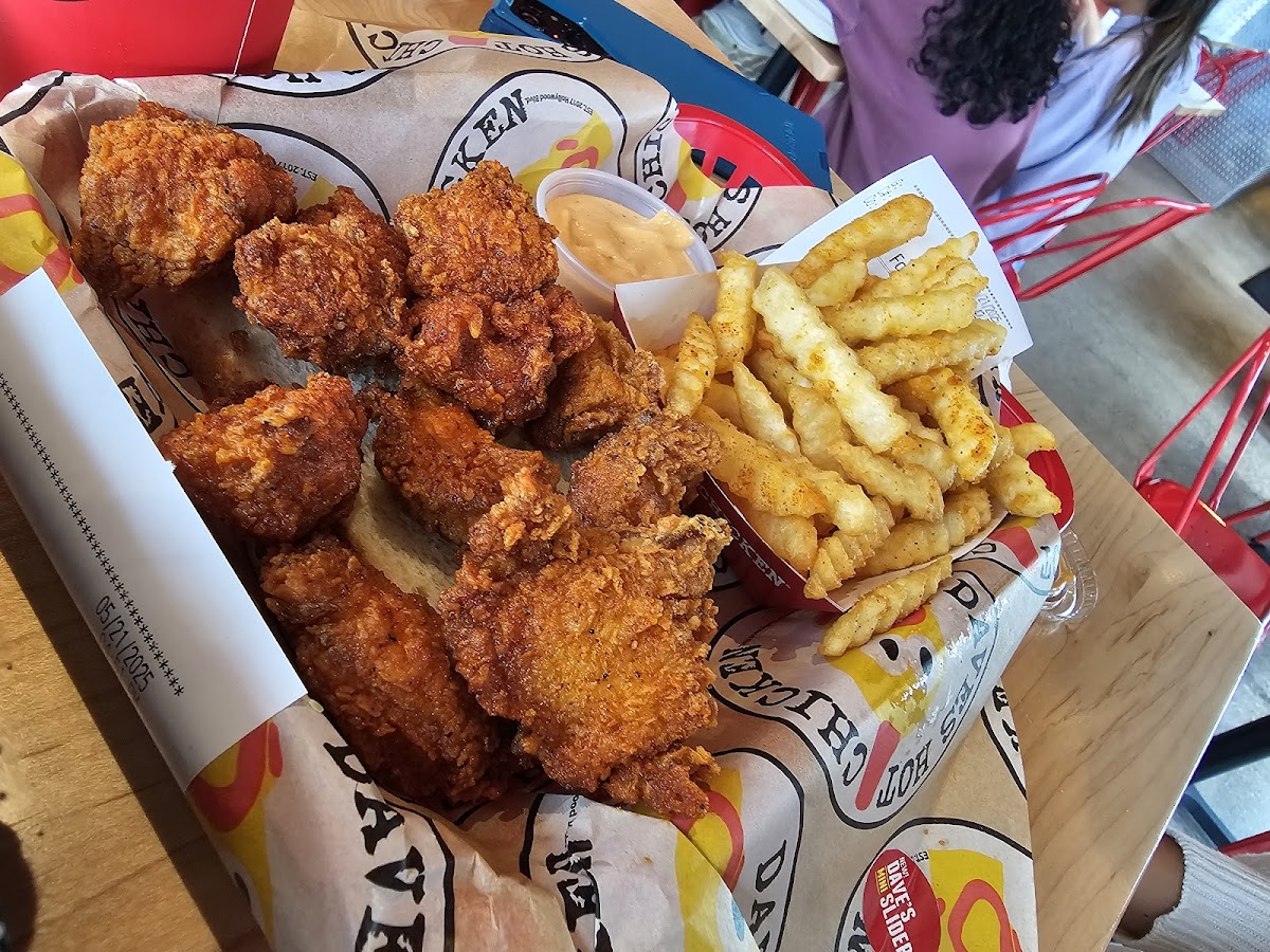 Heard great things about Daves from friends. So excited that they are now open. Ordered the two tender meal. The meal comes with fries. I also ordered their loaded fries which has cheese sauce ,chicken, fries on a bed of kale. I got the medium heat and it was not that spicy. The tenders are huge. The breading is pretty crunchy, but the chicken itself is very juicy and tender. Fries were fresh and have a good seasoning on them. The place was really steady. Great news, they are open until 11pm every night